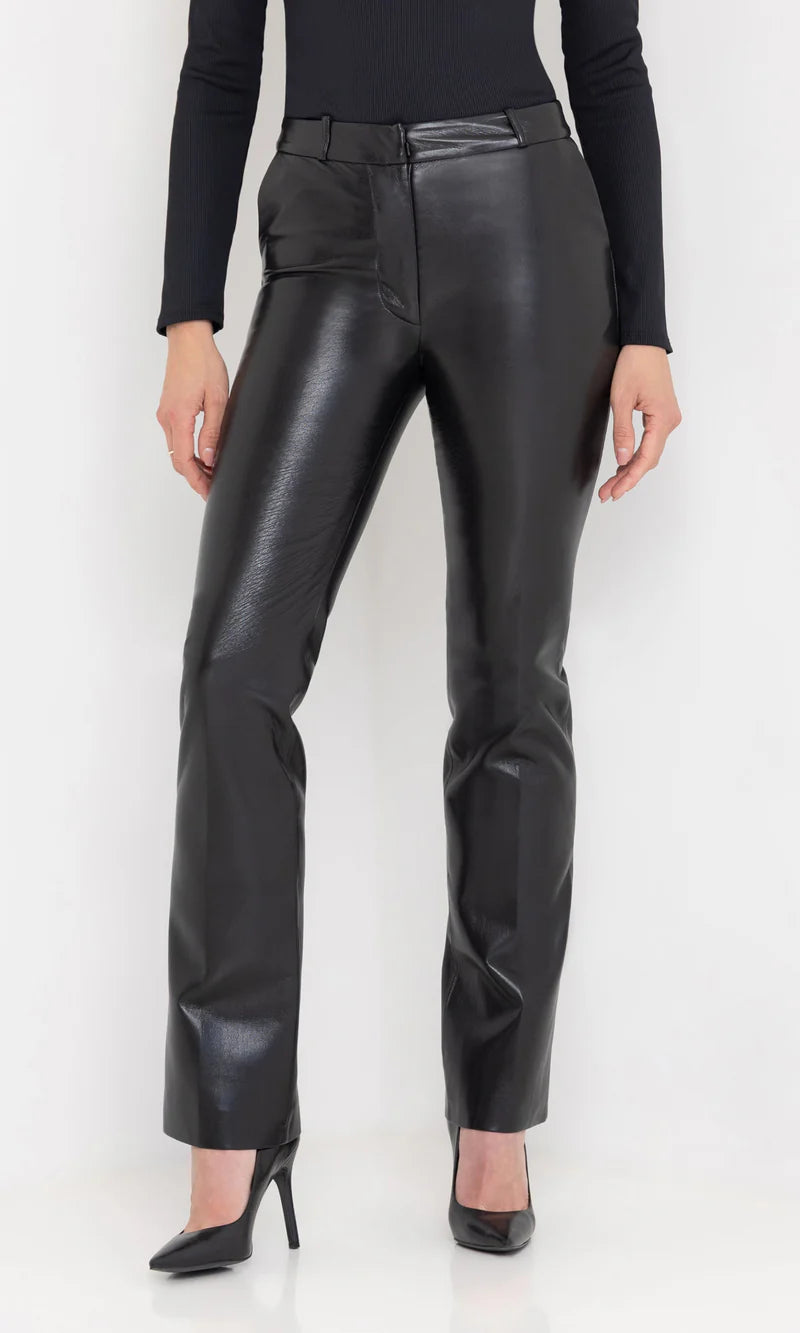 With a high waist and straight-leg silhouette, these vegan leather pants offer a refined take on a classic style. Clean lines and a sleek finish make them a versatile option - style with a lace blouse or rib knit top for looks that are both bold and chic.