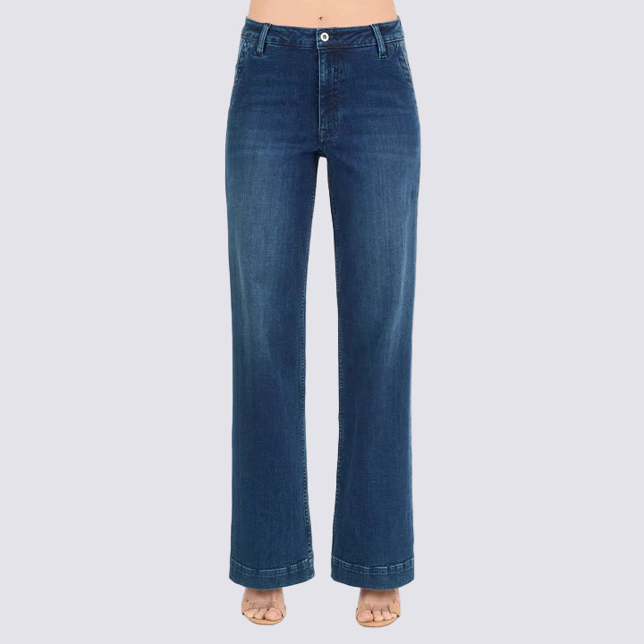 Your new go-to mens wear inspired jean. The Confidante is a mid-rise, wide-leg pant designed to flatter and move with ease. Crafted from a soft, garment-dyed stretch twill, it features subtle fading, utility-inspired back pockets, and an effortlessly elongating silhouette.