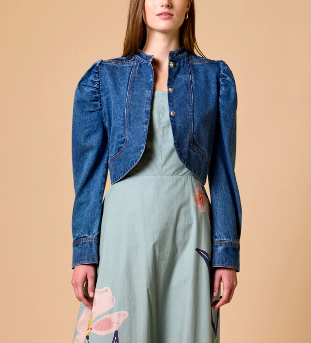 Crafted from 100% cotton, the Damien Denim Jacket is defined by its cropped silhouette, romantic long puff sleeves, and a refined mock neckline make this an elevated take on timeless denim.
