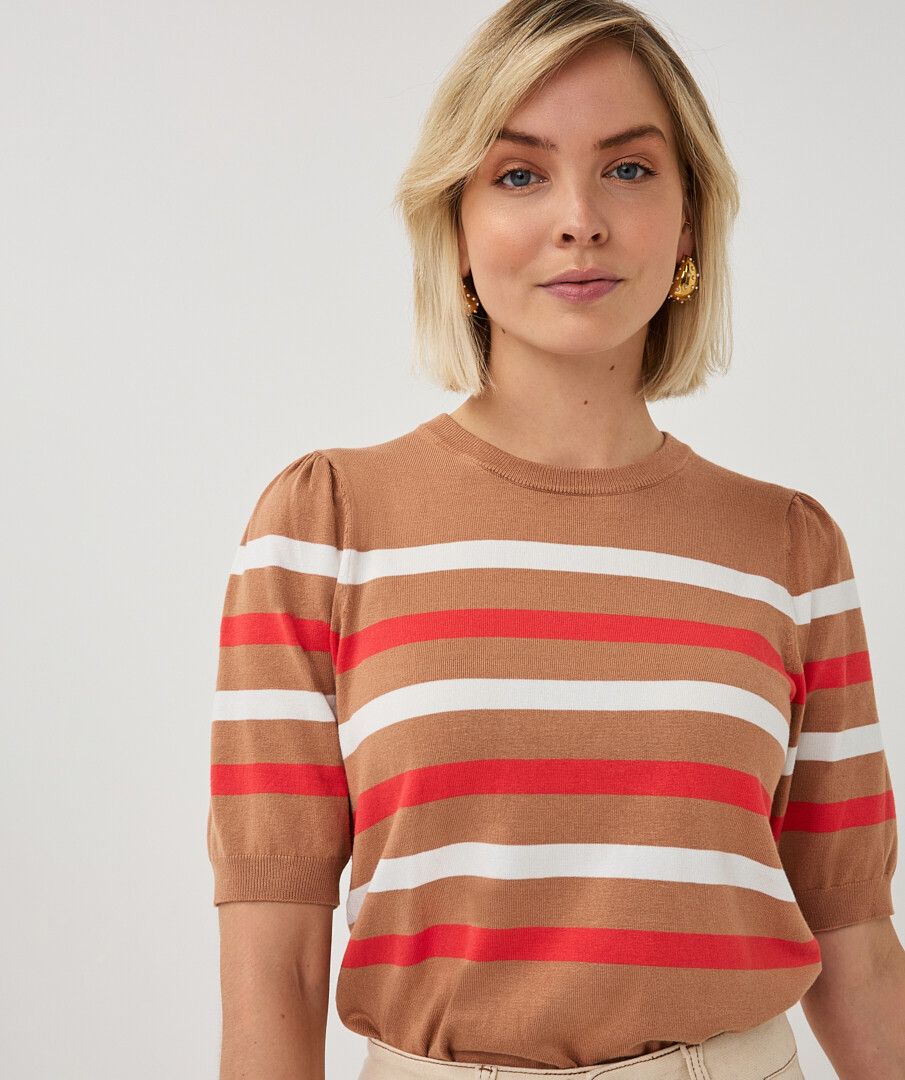 Fine knit sweater with stripes, a round neck, and slightly puffed sleeves. The sweater is made from 78% viscose and 22% nylon.
