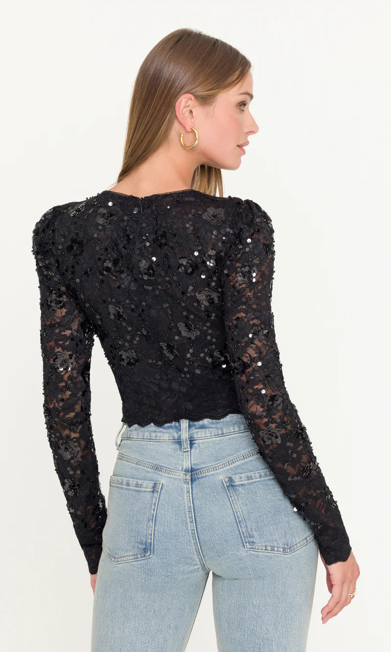The Safia Sequin Lace Top brings delicate texture with after-dark shine. Cut in a slim cropped silhouette, it layers sequin‑touched lace over a soft lining for coverage without bulk. In classic black, it reads romantic yet modern.