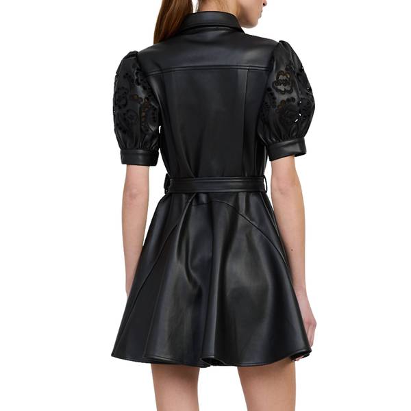 Crafted from solid black faux leather. Features an A-line fit and flare silhouette with short puffed sleeves, adding a touch of textured elegance. Button closure and collared neckline offer a structured, modern edge perfect for cocktail parties. Embodies a preppy trend ideal for fall occasions.