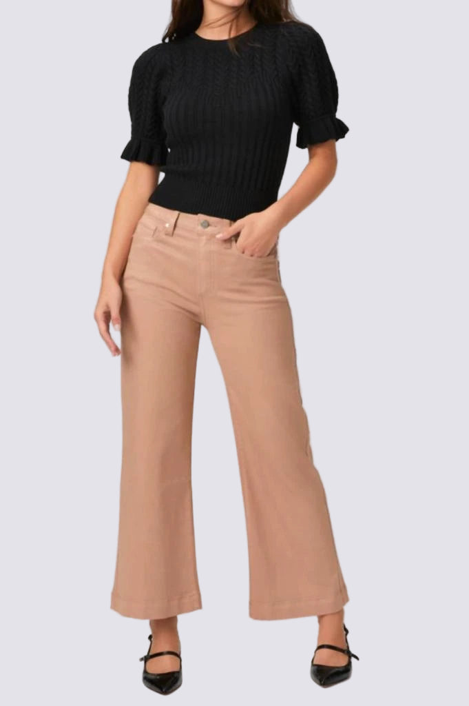 Paige Anessa Jeans in French Latte Luxe Coating are a high-waisted, wide-leg style with a relaxed, ankle-length silhouette. They are made from a coated denim that gives them a leather-like appearance while remaining soft and comfortable with stretch. The jeans feature a zip fly with button closure and classic five-pocket styling. The color "French Latte" is a neutral beige hue.
