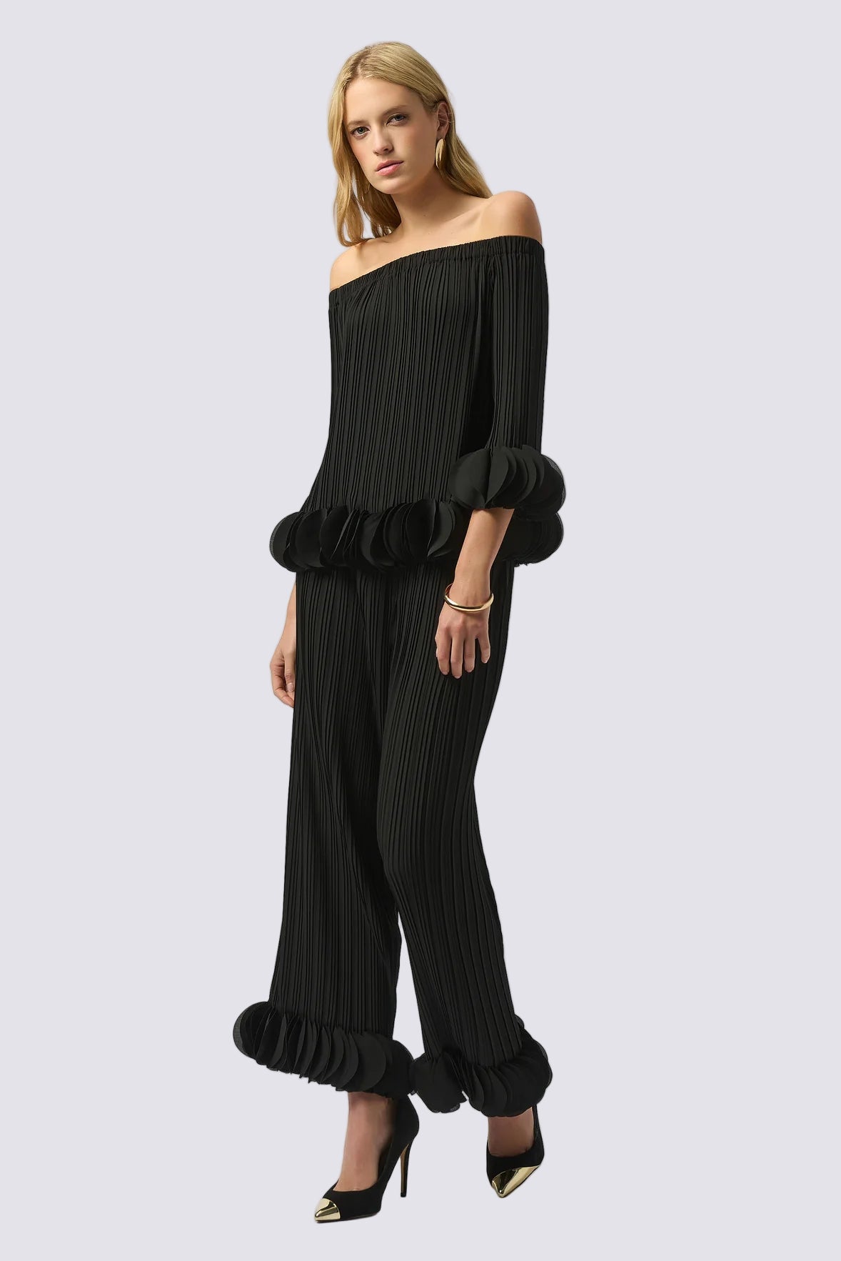 Steal the show in these stunning wide-leg pants, crafted from lightweight, flowy georgette for effortless elegance and movement. Delicate pleating adds volume and flair, while a structured contour waistband flatters the waist for a polished silhouette. A bold circle appliqué at the leg openings adds a unique, eye-catching touch, making these pants a perfect choice for any special occasion.