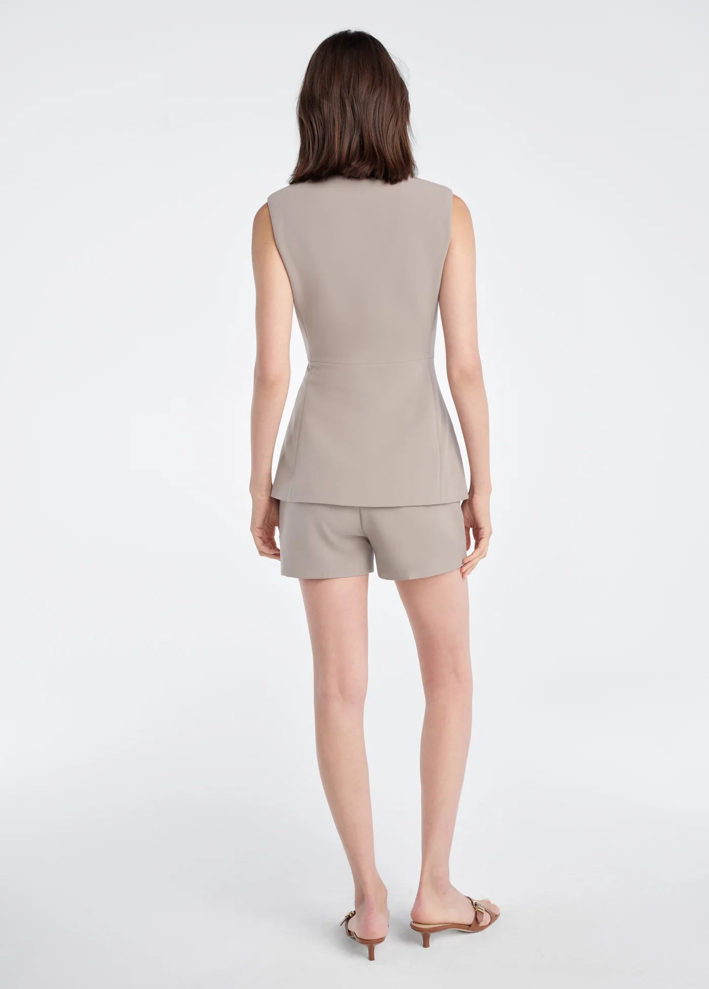 The Clocking In Top is a long-line vest with a crew neckline, exposed buttons, and a fitted waist that flares ever so slightly. it's cut from a structured suiting blend and looks especially chic when paired with The Favorite Mini Short.