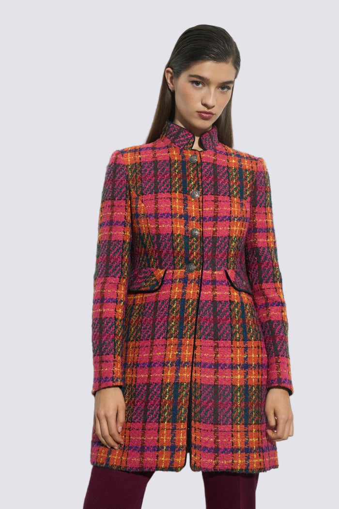 Long, fitted, military-style blazer. Checkered print. Mandarin collar. Front metal button closure. Contrast piping detail. Faux flap pockets with metal buttons. Long sleeves with two-button closure. Straight hem with no vents. Designed and made in Spain. 100% POLYESTER