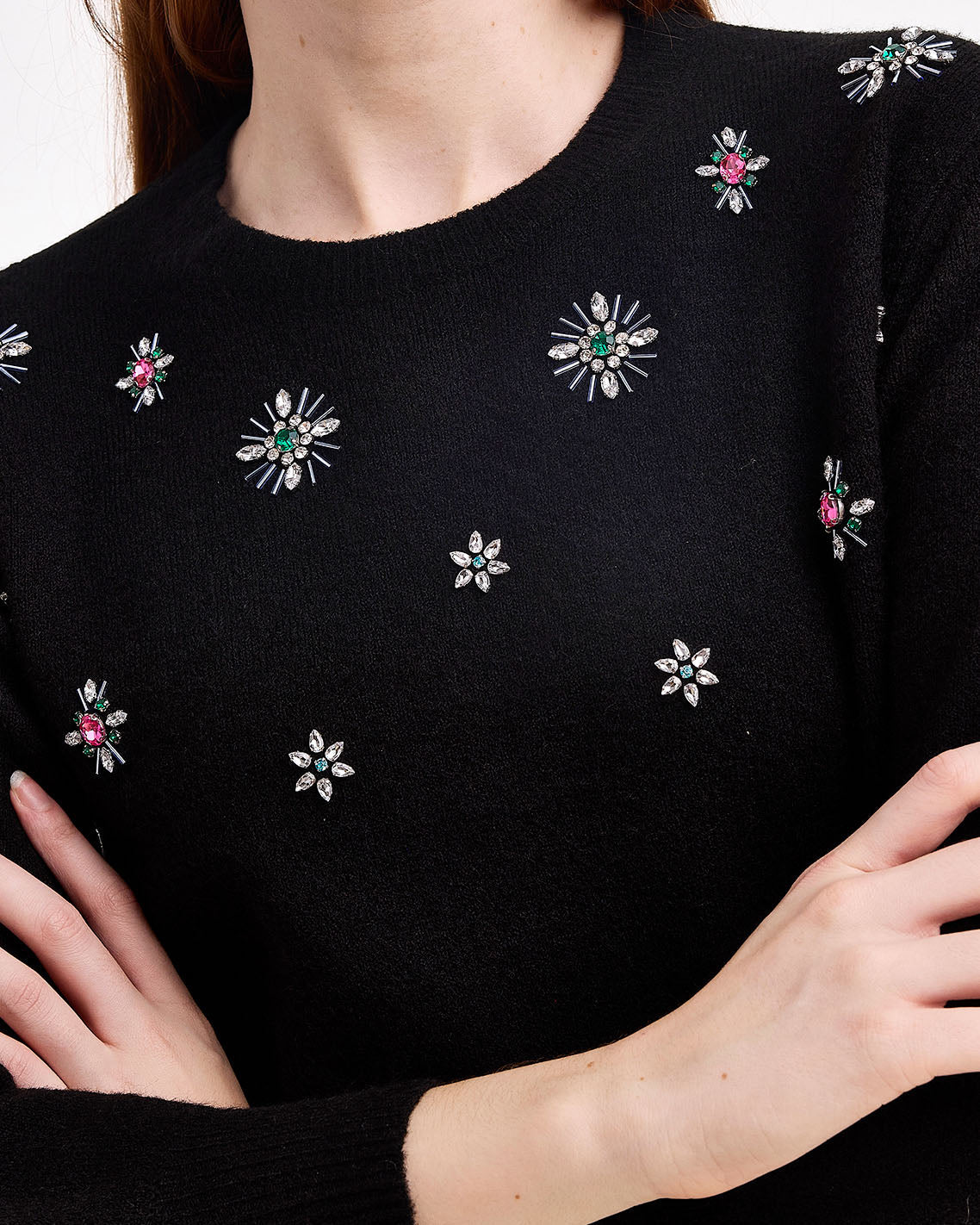 Sparkle plenty. Our Embellished Crewneck Sweater is knit from a cozy blend with the ideal amount of stretch and decorated with colorful gems, for a festive look that's perfect for the holidays. Pair it with your favorite black pants or jeans and you're ready to party!