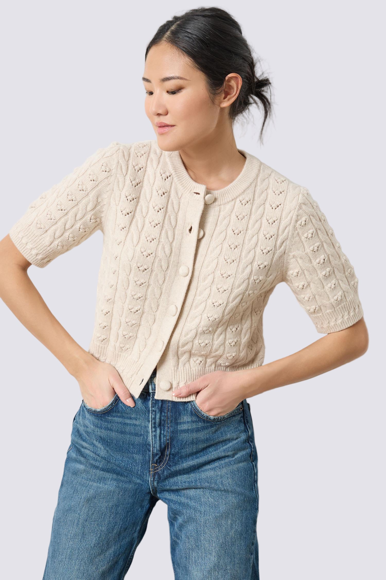 The Short Sleeve Cardigan Sweater in our New Luxe Cashmere Blend is soft, cozy, and eco-friendly. This luxurious yarn holds stitches beautifully, highlighting the intricate stitch details and delicate self-covered buttons. Worn alone or layered over a crisp Poplin button-down, it pairs perfectly with our Twill bottoms or your favorite denim for an elevated yet easy look.