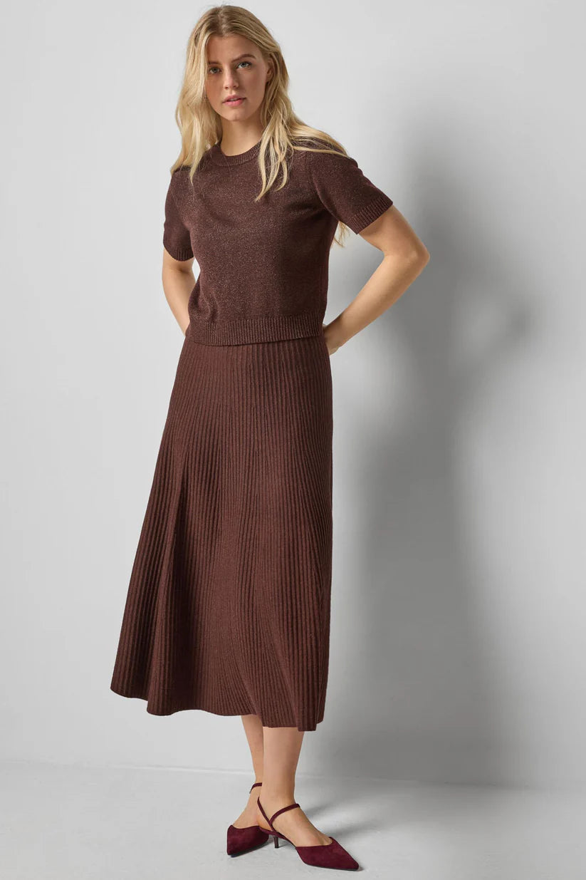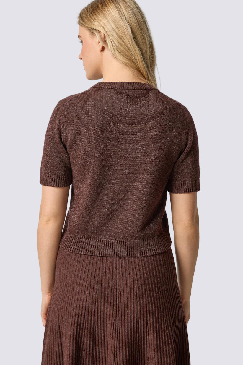 Think of your favorite tee, reimagined as a sweater. Knit in breathable cotton with just a touch of cashmere, this midweight yarn is soft, comfortable, and perfect for those who prefer cotton. A hint of subtle lurex adds just the right amount of sparkle, making this the perfect piece to elevate any holiday look. Designed to fit close to the body with a slightly shorter length, this sweater pairs effortlessly with the coordinating knit skirt or denim for an effortlessly chic outfit. For a timeless twinset, layer it with the matching cardigan.