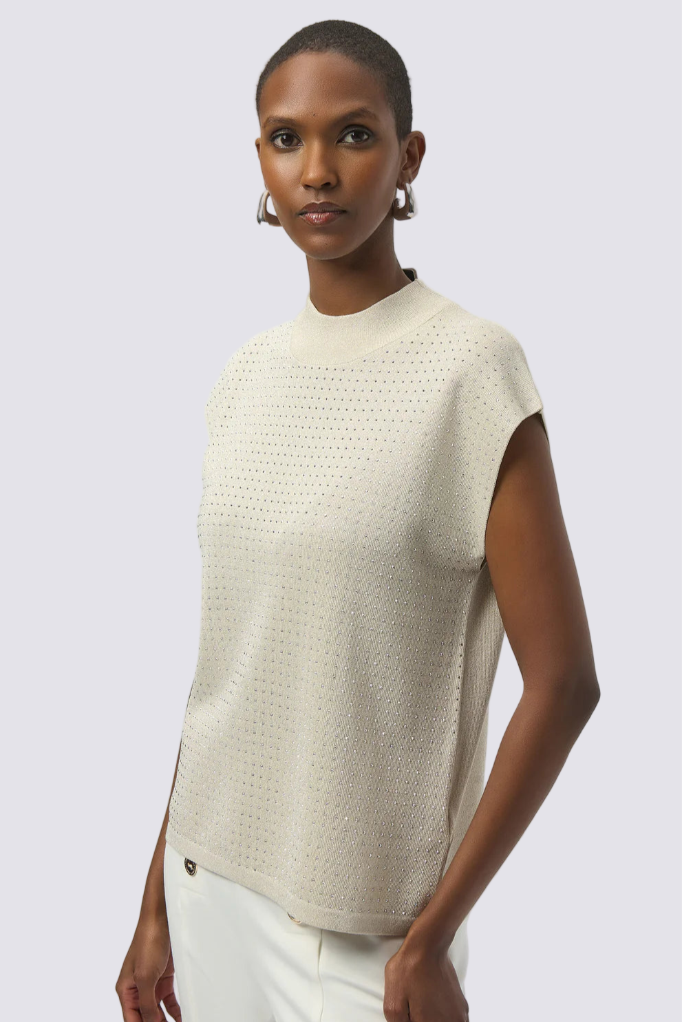 This sleeveless pullover by Joseph Ribkoff combines refined style with comfort, featuring a sophisticated mock neck and distinctive iron-on detailing. Made from soft sweater knit fabric, its straight fit offers a flattering silhouette that complements various outfits. Ideal for elevating your occasion wardrobe with understated elegance.