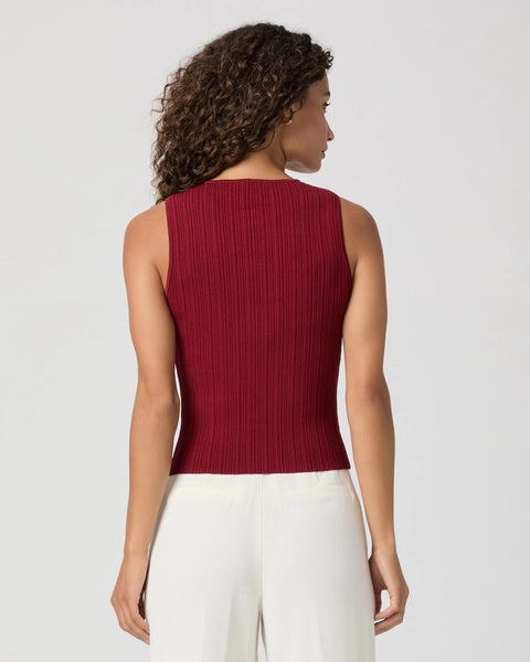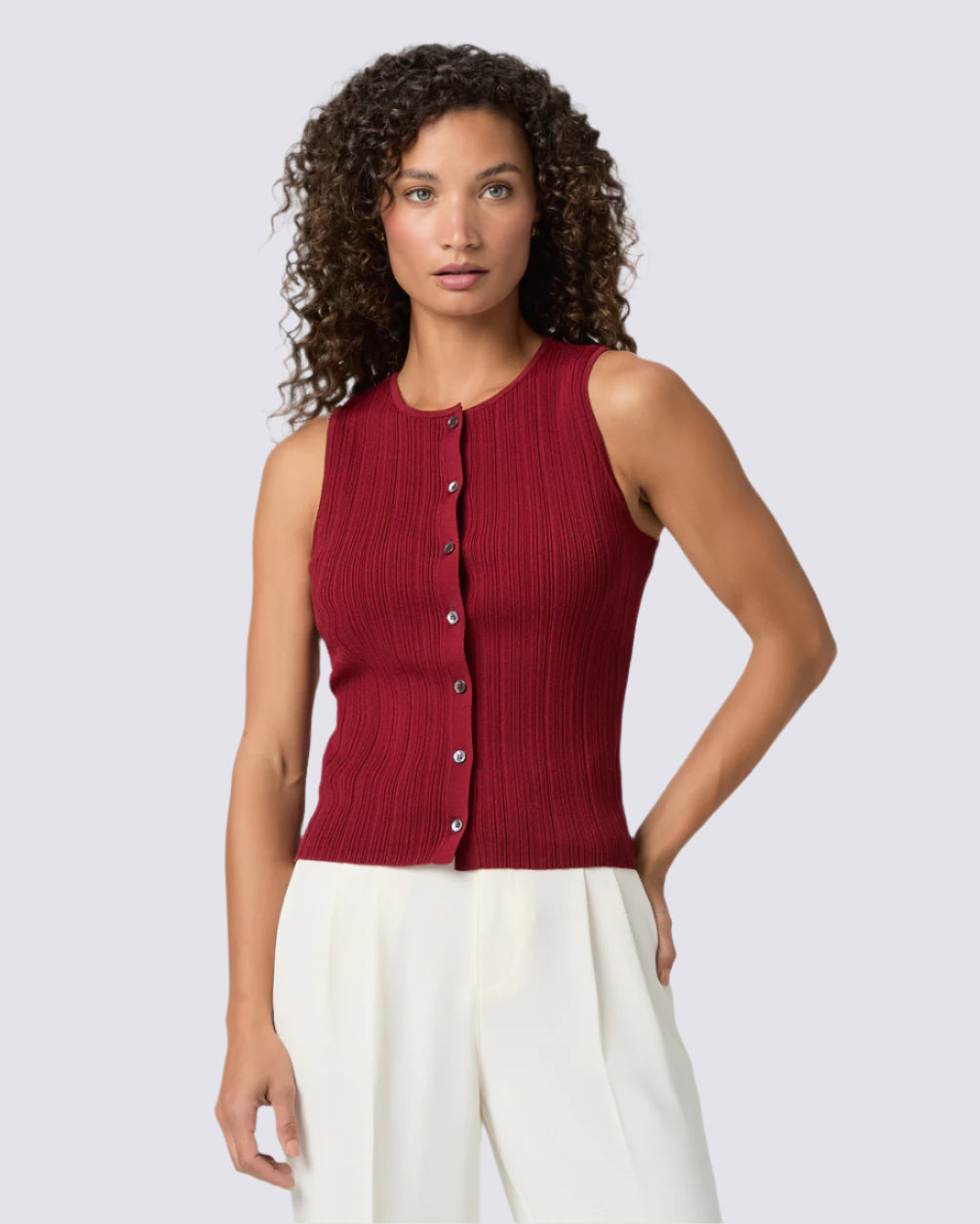 Crafted from a nylon yarn blend with an elevated feel, this slim cranberry sweater tank has a pleated effect with a crew neckline and a button front design. Leira is the perfect layering piece to add to your year-round wardrobe.