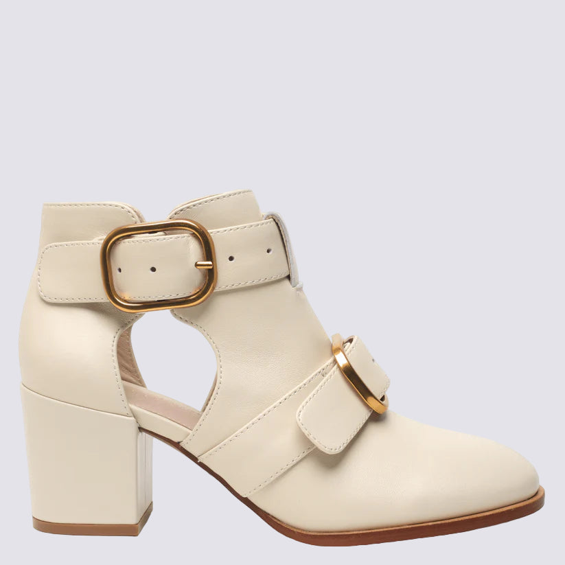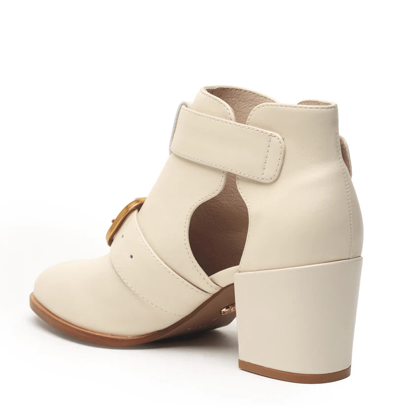 Buckle up for a fun night in this striking leather cutout boot, highlighted by gold hardware and wide straps. A low block heel and a round toe make for street-chic style.